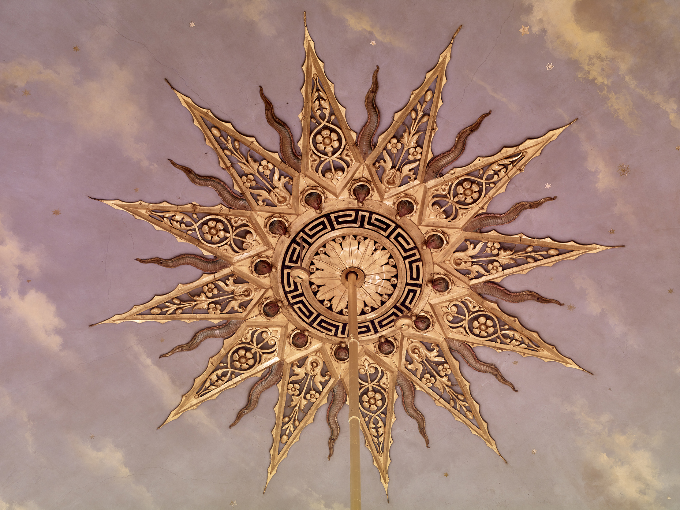 Famously, and in the teeth of opposition, the town council bought the pavilion in 1850. It not only saved it from demolition, but redecorated the interior of the Saloon. The present ceiling and its central star were probably created in 1864. Then, in 1896, J. G. Crace, another in the dynasty of London decorators, redecorated the room.