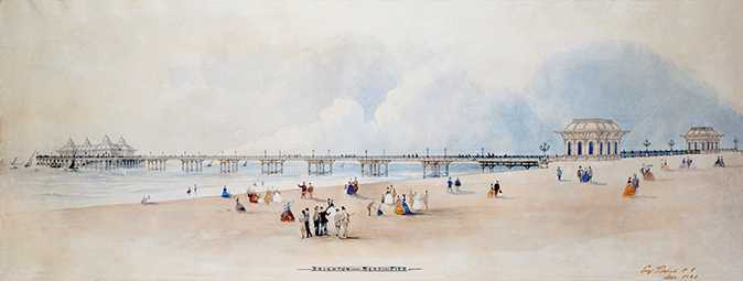 Competition between resorts was so fierce that Birch was able to make significant innovations. When his suggestions for replacing Brighton’s Chain Pier were rebuffed, he worked with a new company to design a modern rival known as the West Pier. At the pier head, furthest from the shore, he widened the deck to create a large open space, at the four corners of which were octagonal ‘houses’ designed as separate ladies’ and gentlemans’ ‘lounging’ and refreshment rooms.