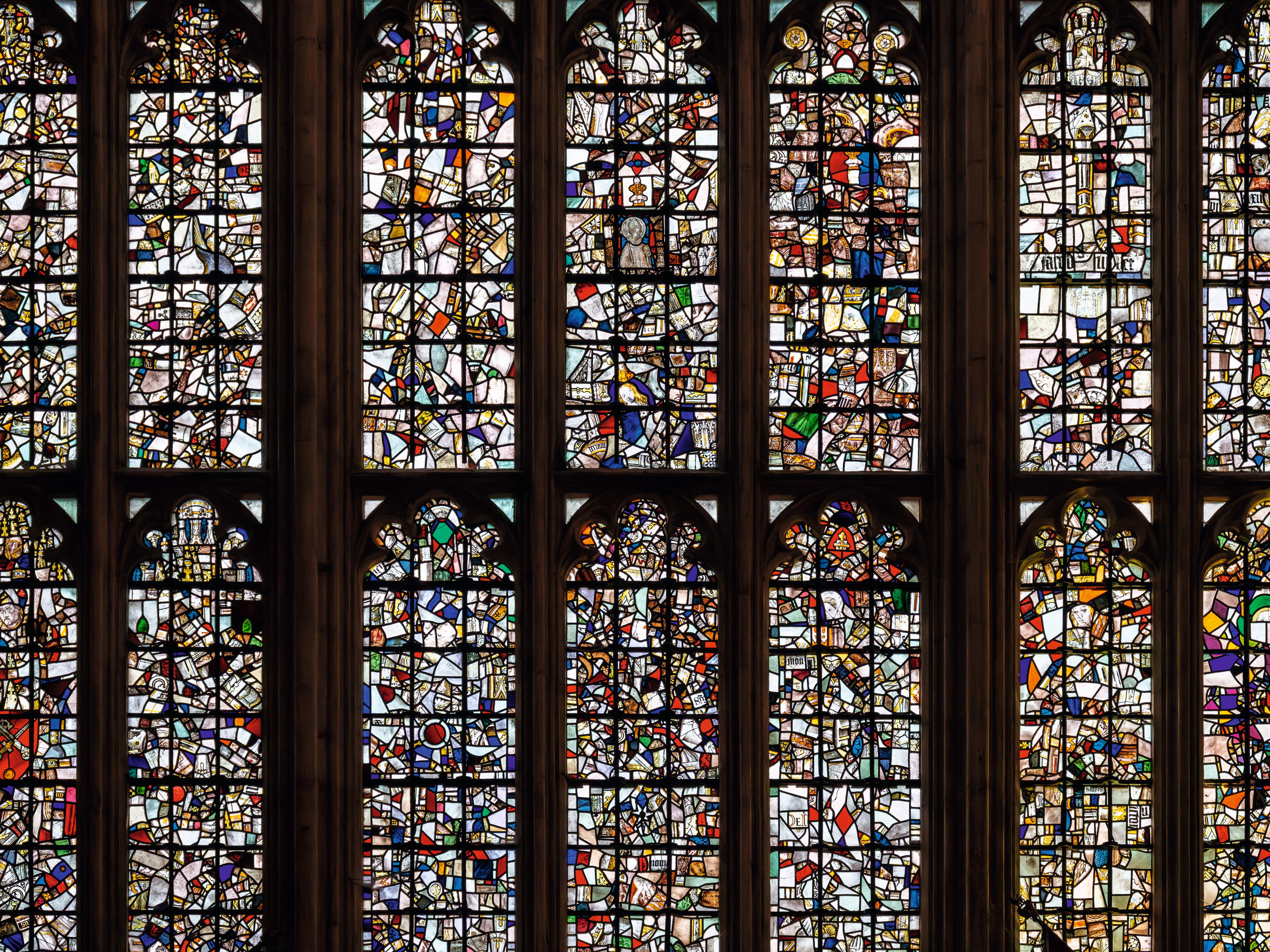 Magnificent mosaic: the vast sweep of the cathedral’s Great West Window is fashioned from fragments of the medieval glass that were hidden after being smashed by Puritans.