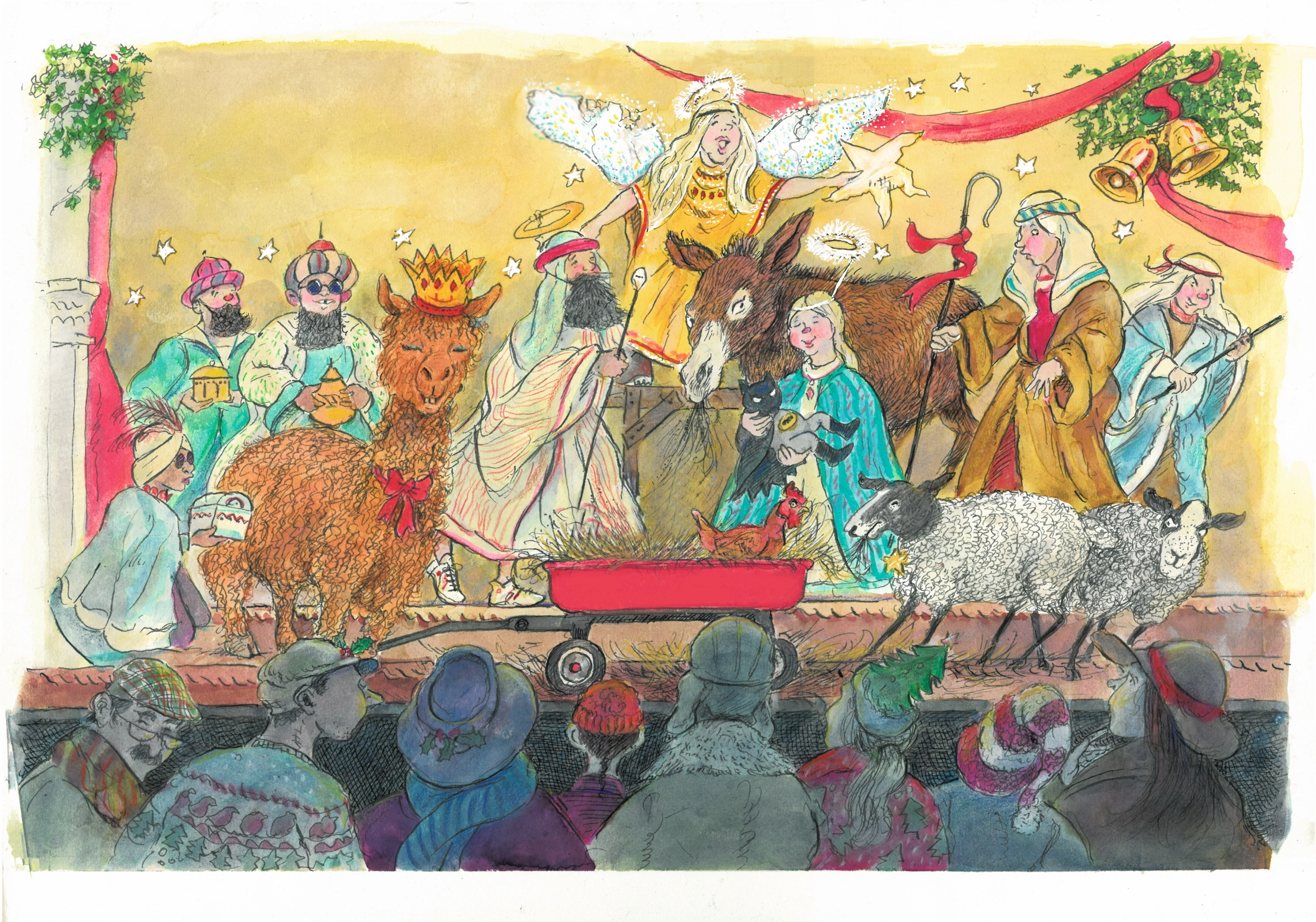The cast is assembling outside. Miss Snow the smallholder has fluffed up the white coat of her prize alpaca, Sprout, who is well used to being the centre of attention as he is getting all sorts of employment as a ‘tranquillity animal’, visiting nursing homes and the like. Less reliable is Lord and Lady Berry’s elderly donkey, Carrots — Mrs Cranberry’s one concession to health and safety is for Carrots to be led into church, rather than ridden; Mary and baby Jesus being neatly bucked off is still fresh in the memory.