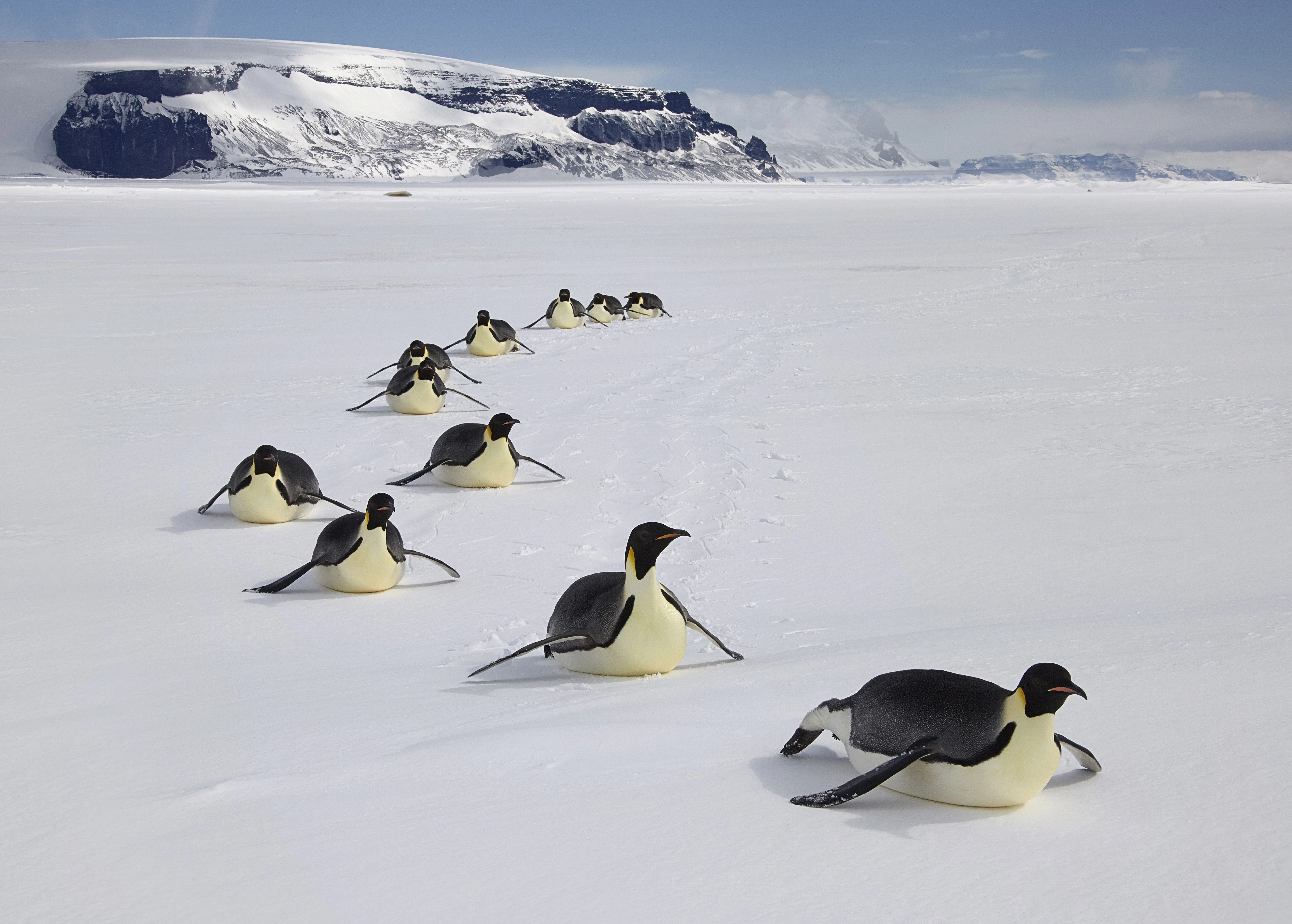 A group of emperor penguins sliding over the ice in Antarctica. Luge athletes in the making — every single one of them.