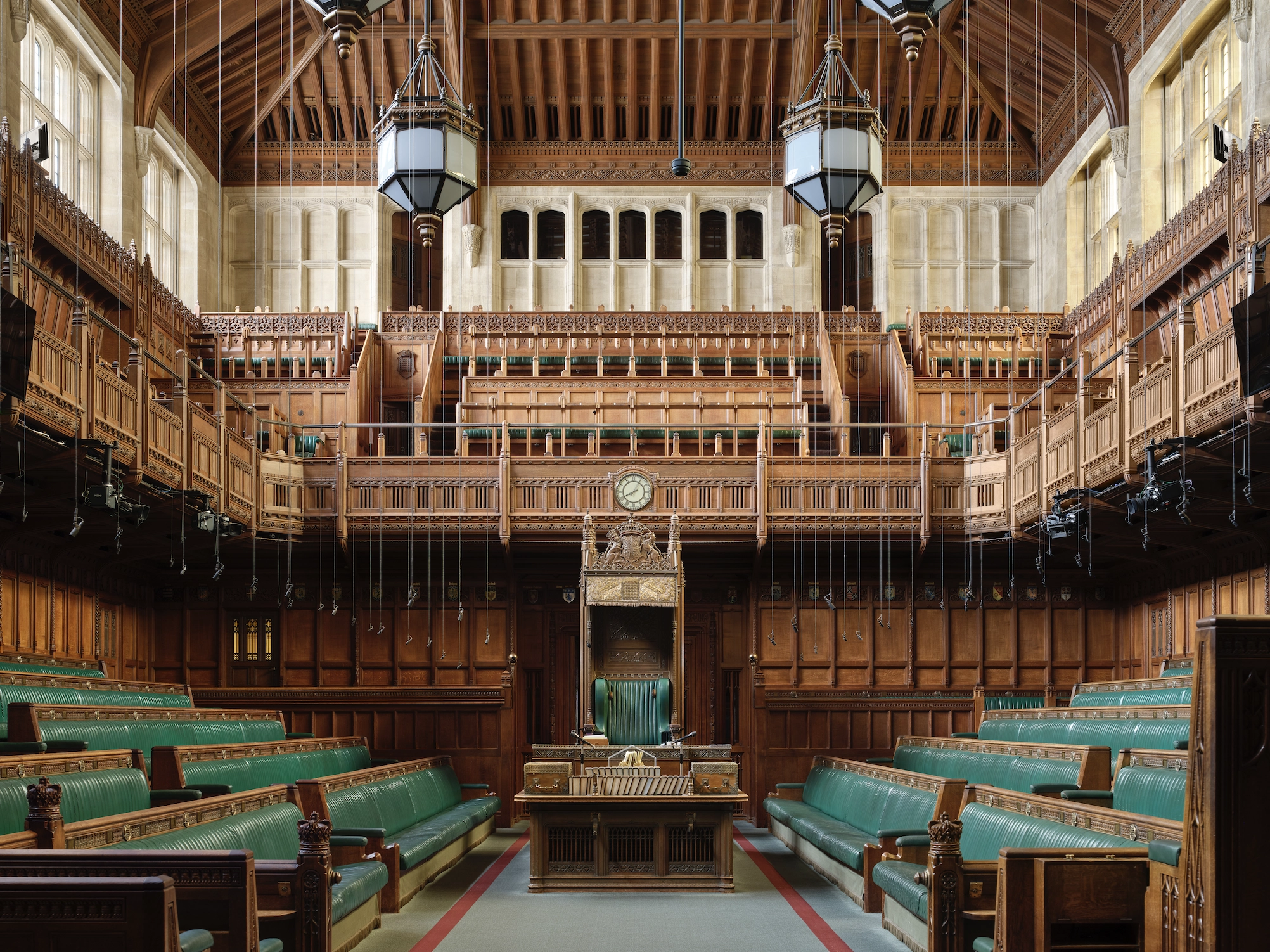 Internal galleries for visitors had been part of the Commons since the 1690s. These were expanded at the ends of the room and the distinct spaces for men and women integrated to create a single Strangers’ Gallery. At the same time, the columns that had previously supported them were removed, opening out the floor of the chamber. This was initially planned by Scott with more upright benches furnished with a new machine-woven wool tapestry called Replin. MPs, who had enjoyed slumping on Barry’s leather-covered originals, however, demanded that the old benches be exactly re-created with upholstery in the Tudor livery of green. In concession to the poor acoustics, a miniature speaker was fixed in the back of the benches every two seats.