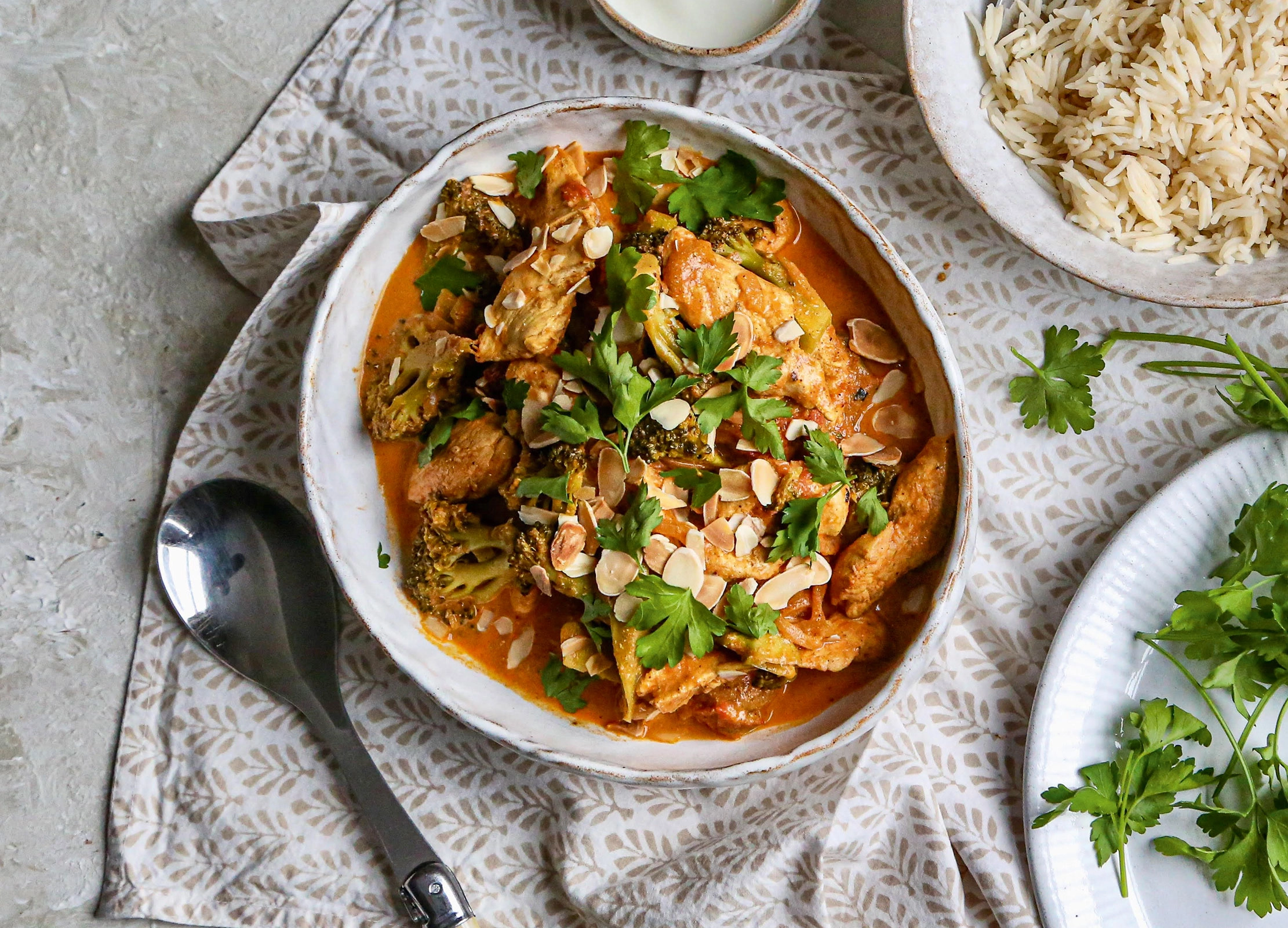 Return the chicken to the pan, add the broccoli and simmer to finish cooking the chicken and to cook the broccoli. Pour in the cream, mix, and then scatter over the flaked almonds and fresh coriander.