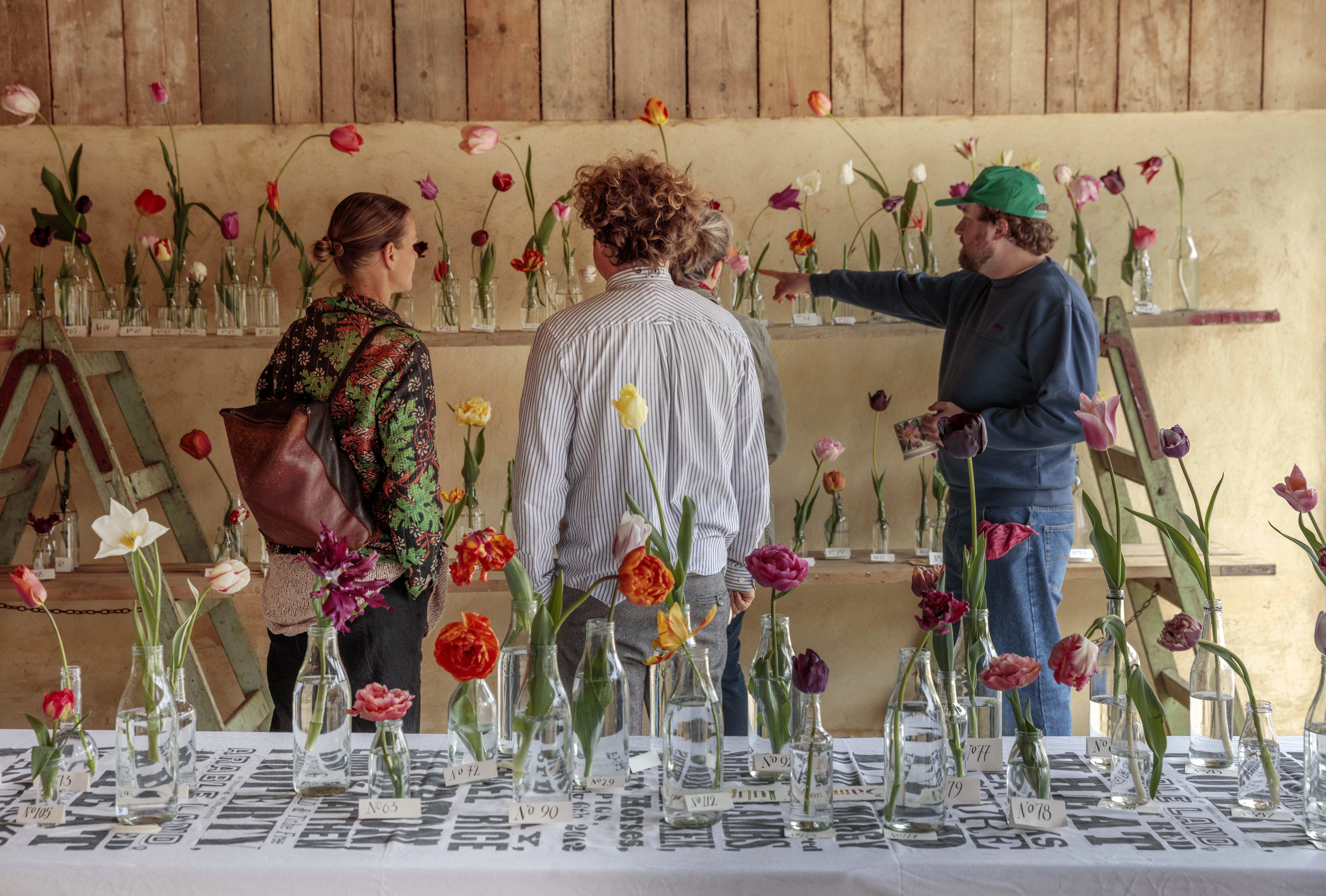 The contest has different classes — Parrots, Decorative, Lily flowered and so forth — covering several of the 16 divisions of Tulipa. Each stem is displayed in an old milk bottle, a nod to the traditional brown beer bottles long used to display historic tulips by the Wakefield and North of England Tulip Society. Each entry is numbered on a card in Matthew's sweeping calligraphic script.