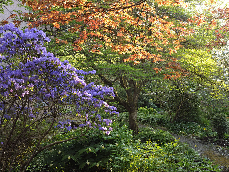 You are sheltered by a lovely canopy of mature rhododendrons, maples and sorbuses, interrupted by outcrops of sheer white granite that illuminate the space. If you look up, you will catch sudden bursts of dramatic sky between the huge felted leaves of the rhododendrons or the almost artificially geometric criss-cross patterns made by the branches of Abies squamata.