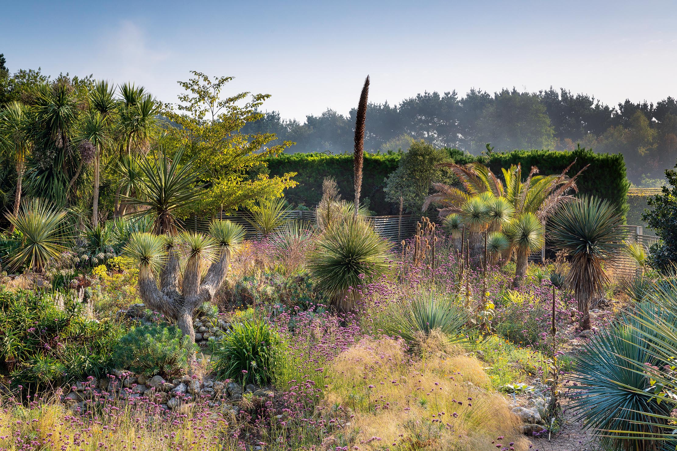 Named the Desert Wash, this is a spectacular feat of landscaping and one of the most thrilling achievements here. More than 400 tons of flint, layer upon layer of gravel and a vast array of boulders were used in its construction, resulting in an undulating landscape of great beauty. Agaves, cacti, aloes and puyas throw sharp shadows across drifts of Eschscholzia californica and Verbena bonariensis. The riverbed ripples with agapanthus seedheads, the dusky blue repeated in the glaucous, succulent spears of Hesperoyucca whipplei. Shaggy trunks of Yucca elata loom out of the rocks, like members of the Addams Family.