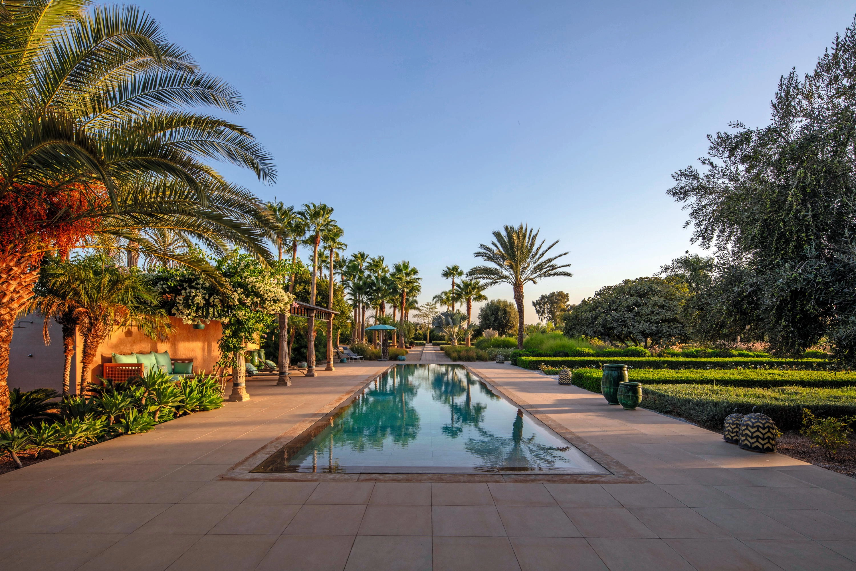 The central axis is defined by a rill, lined with white plumbago and shaded by ele-gant Syagrus palms. The Atlas mountains shimmer through the distant pink haze.
