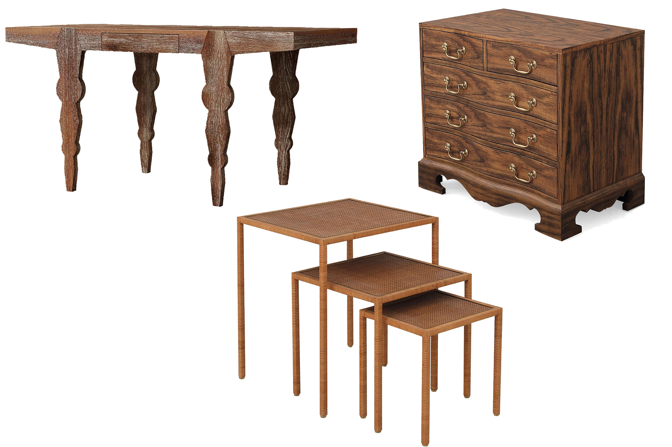‘I’m incredibly proud of what we have achieved — our pieces will always surprise and tell a story, whether in shape or finish,’ he says. From the capsule collection launched to celebrate the 35th anniversary, (clockwise from top-left): Kemp oak desk, £2,640; Anglo-Indian chest, £2,964; Felix nest of tables, £2,016. www.julianchichester.com