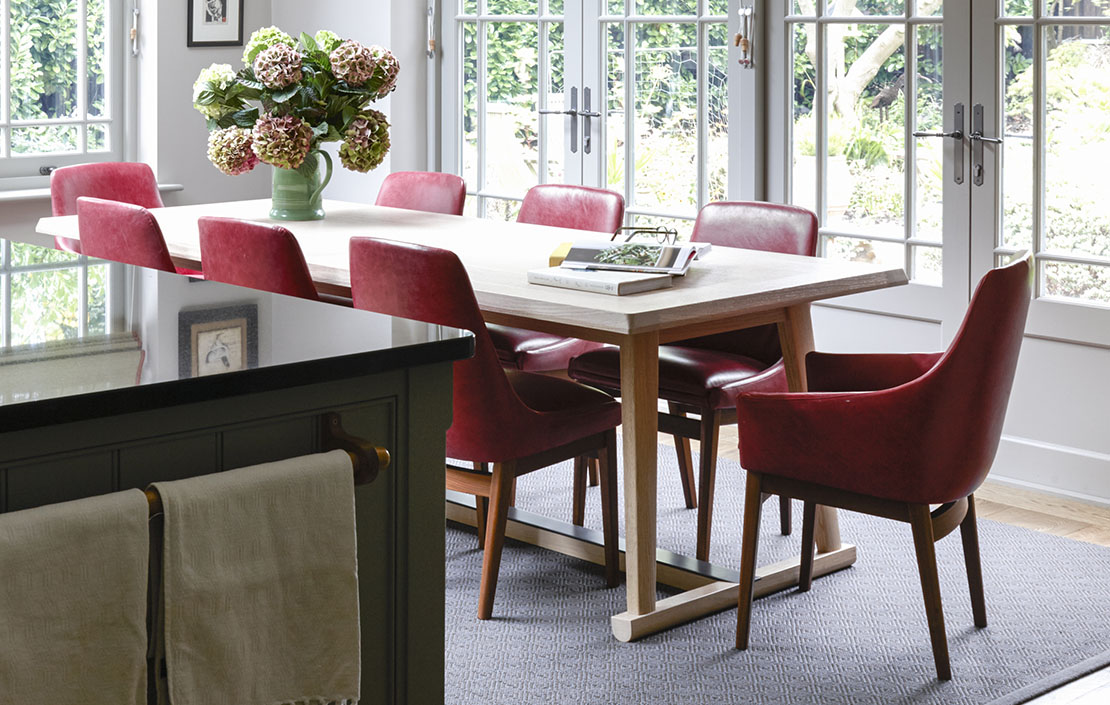 Colour was introduced with a set of chairs from Birgit Israel, which Charlotte upholstered in red leather. The table is Recepio by B&B Italia. Above it hangs the Apple Pendant, with its shimmery copper interior, by Holloways of Ludlow.