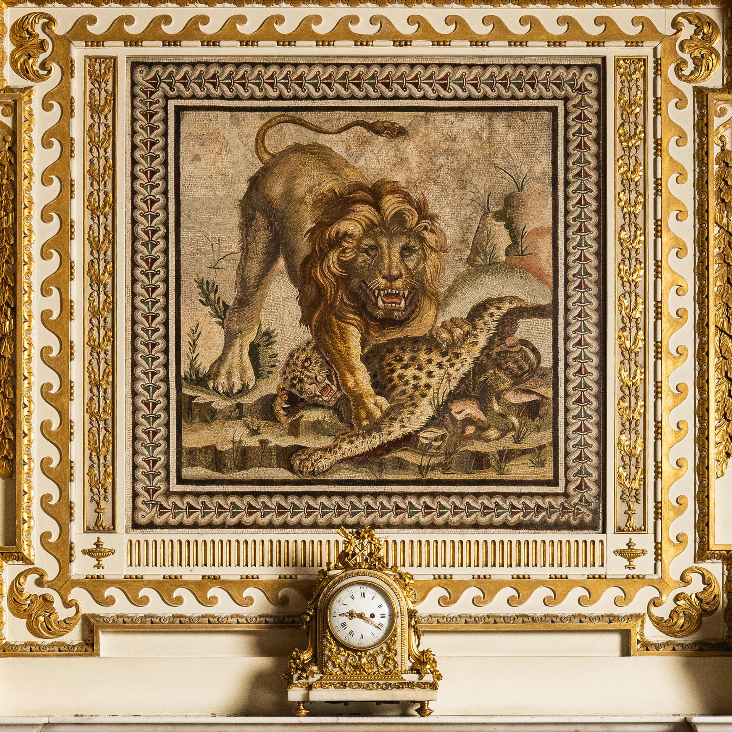 Set in the overmantle is an image of a lion triumphing over a leopard. It is presented as a painting in a gilt frame — and replaces a seascape by the 17th-century artist Claude Lorrain — but is, in fact, a micro mosaic.