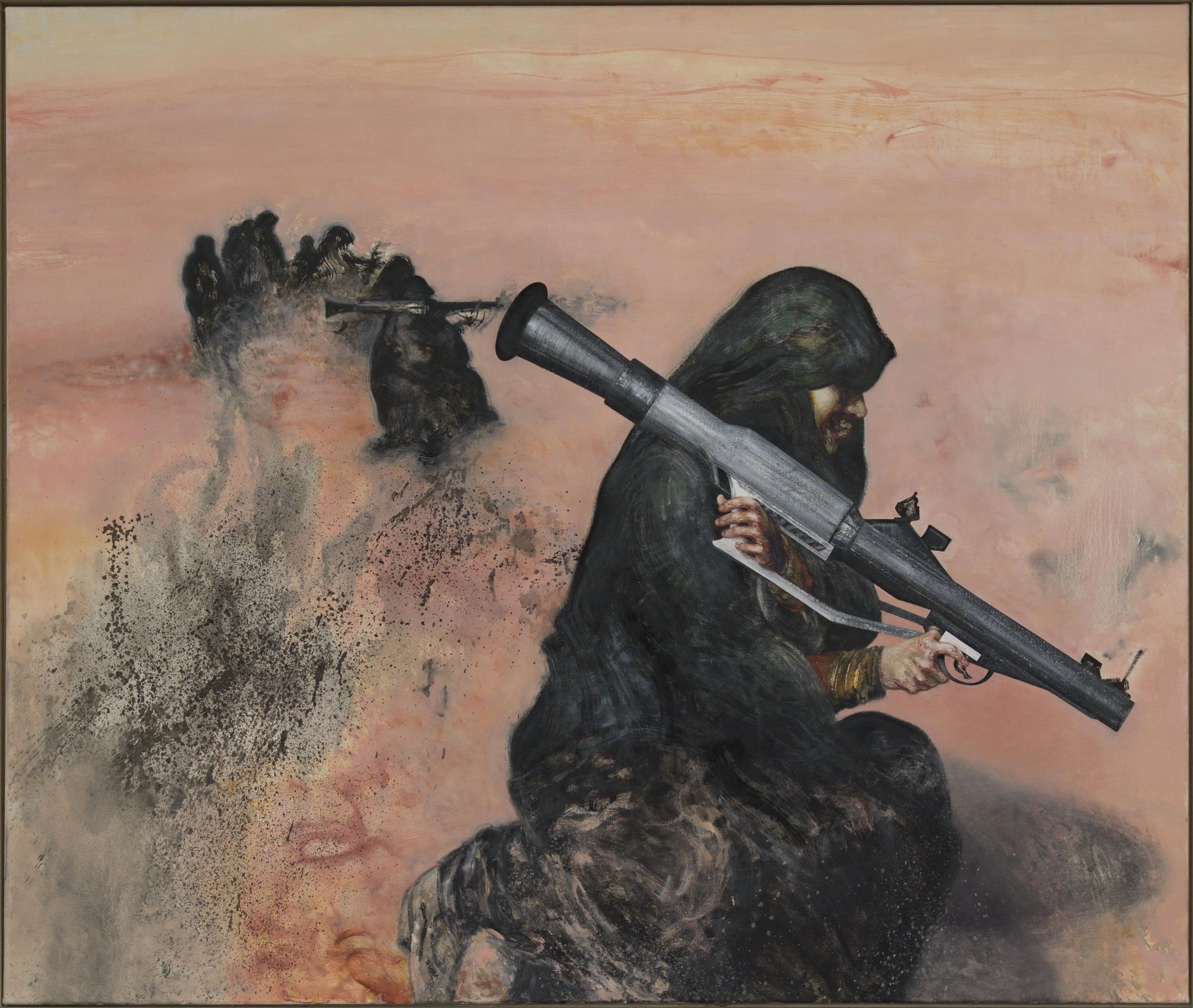 This large painting by Maggi Hambling is one of the most arresting works you encounter as you walk around Murray Edwards College in Cambridge. A woman dressed in a black hijab and loose-fitting clothes sits in an unnamed location. She is armed with a rocket launcher, her index finger curled over the trigger.