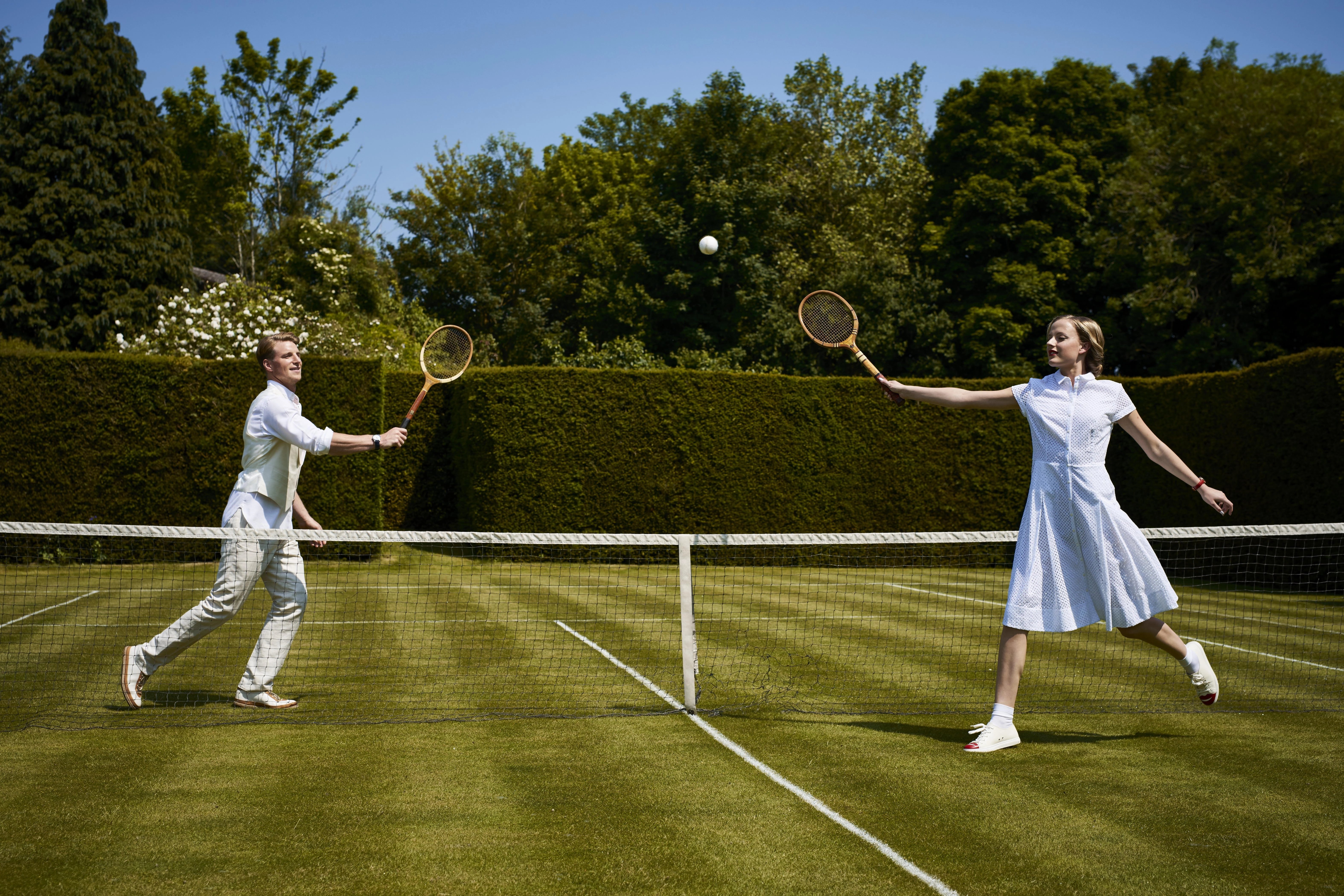 Comfortable clothes were too much for Jilly Cooper’s memorable evocation of the delights of lawn tennis in her 1988 bestseller Rivals. In the grounds of Penscombe Court, Rupert Campbell-Black’s fictional country pile, a gravel path teeming with ‘red admirals gorging themselves on the white buddleia’ leads to the court. Concealed behind an 8ft beech hedge, the former showjumper partakes in a flirty game of nude tennis with giggling love interest Sarah Stratton. For Campbell-Black, these are simply ‘innocent afternoon pleasures’. For readers, the cheeky scene denotes a frivolity that captures the fun and freedom of summer encounters on court.