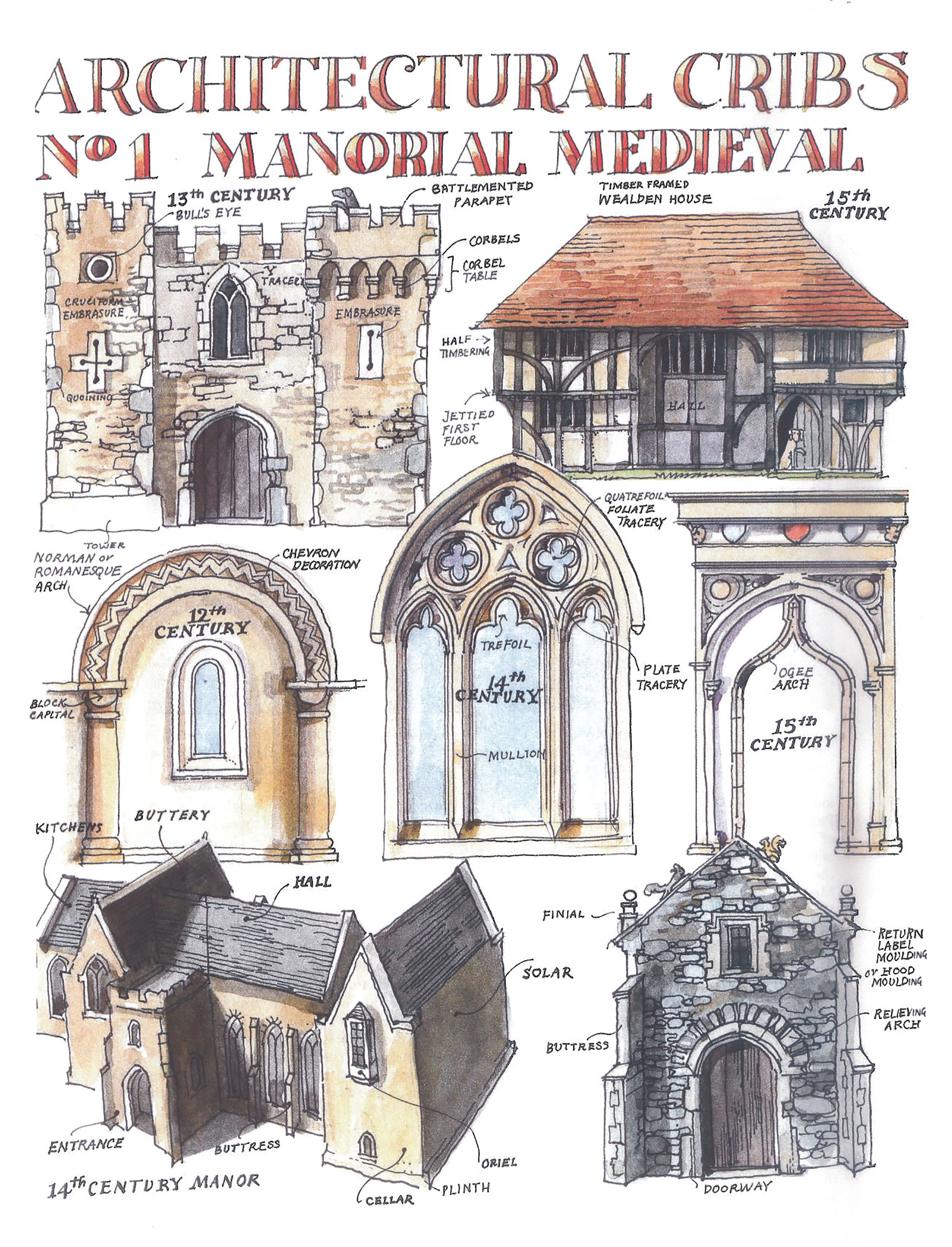 What can be confusing is the terminology for the various architectural elements of the buildings we write about — something which regular Country Life illustrator Matthew Rice tackled for us a few years ago in the beautiful art on this page. Study it for a few minutes and you'll soon be able to tell your trefoils and finials from your cruciform embrasures and battlemented parapets. The difference between and oriel and a buttery will become clear, as will the distinction between romanesque and ogee arches.