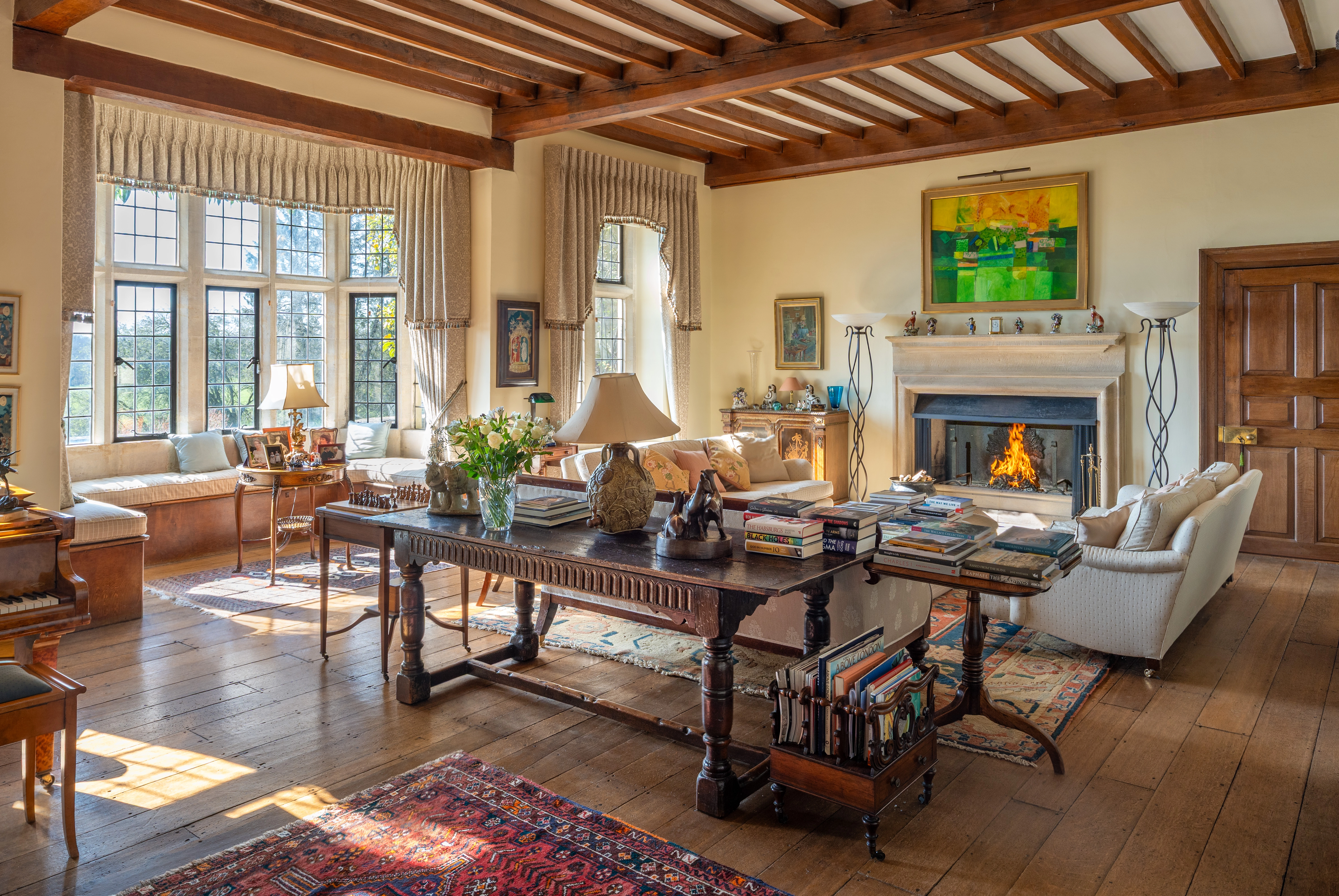The interior has many notable features, including tall ceilings, stone mullioned windows, a beautifully crafted staircase, beamed ceilings and open fireplaces. The layout is versatile, with a selection of reception rooms that cater for both formal and informal entertaining.