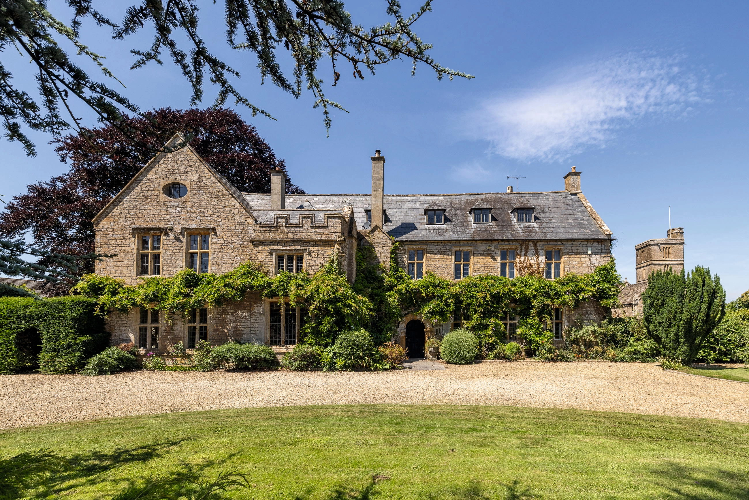 Outside, a high Ham-stone wall marks the perimeter of the front garden, which has well-stocked beds and borders. To the south of the property are a series of lawns and an all-weather tennis court, as well as a small orchard, a kitchen garden with a greenhouse and an oak-frame garage.