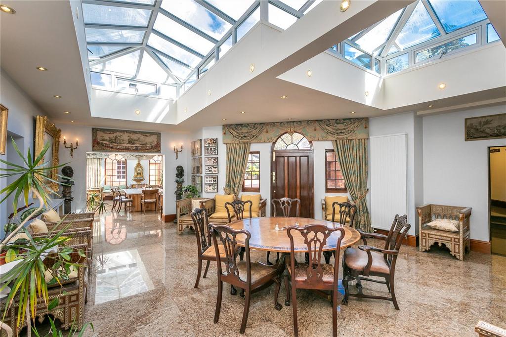 The elegant drawing room leads through arched glass doors into the dual-aspect Summer Room and adjoins the Library, a glorious room with beautifully fitted ornate bookshelves, silk wallpaper and three south-facing, full-length windows that flood the room with natural light; they also provide access to the southern terrace overlooking the Eden.