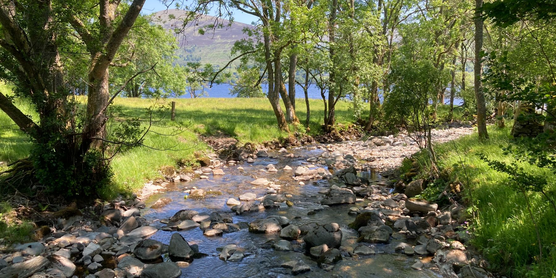 The village consists of just over three acres of land — a paddock, woodland and shoreline with riparian trout fishing rights — on the northern bank of Loch Tay, roughly half-way between Killin and Kenmore, and just off the A827 that leads up to Aberfeldy and Pitlochry beyond.