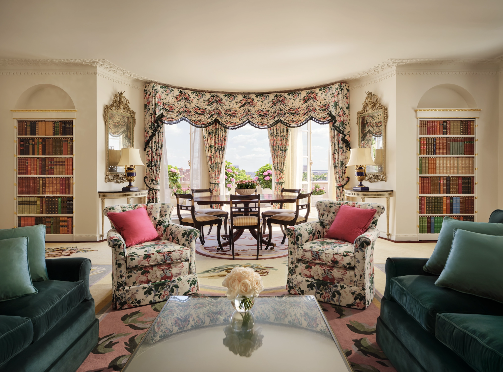 The suite as a whole is a marvel, with a sense of playfulness throughout — exemplified by its ‘bookshelves’ that are actually hidden doors. A parlour for waiting visitors leads through to a well-stocked pantry, sitting and dining room, outdoor terrace and a master bedroom with en-suite bathroom. Messel’s career-long dedication to ballet, opera, theatre and art shines through in all. So does the sun, which beams through the curved French doors to the three-sided terrace when we arrive for our stay (I took my mum along for the experience. We were both giddy with excitement when we saw the suite). Despite overlooking the many building works going on around the hotel, this still serves as the perfect tranquil suntrap on which to relax with a book in one hand and a chilled glass of Dom Perignon (courtesy of the hotel) in the other.